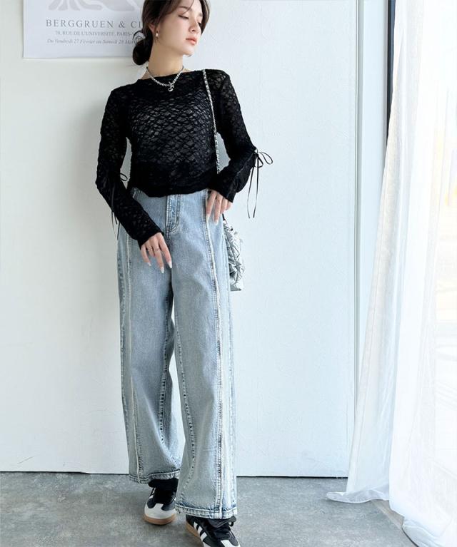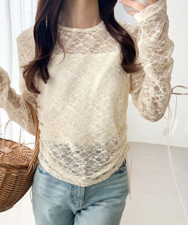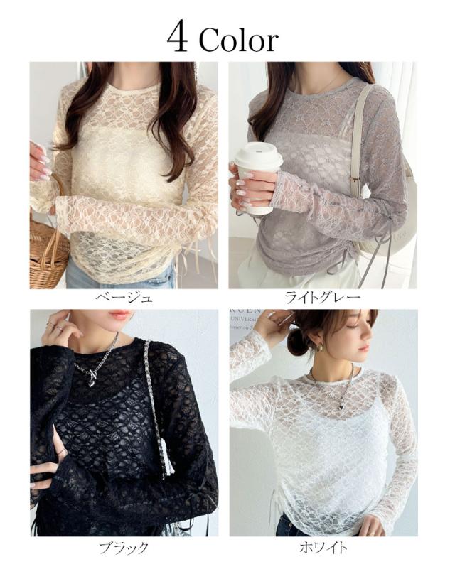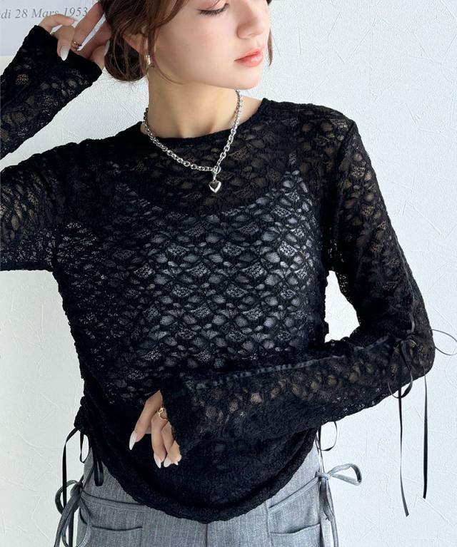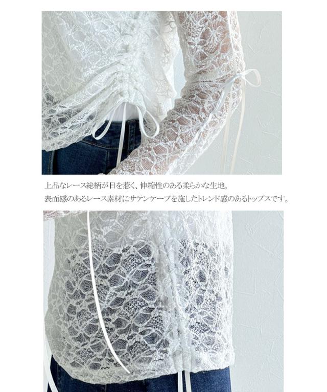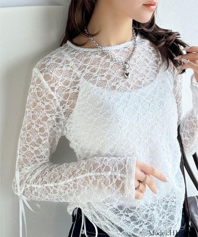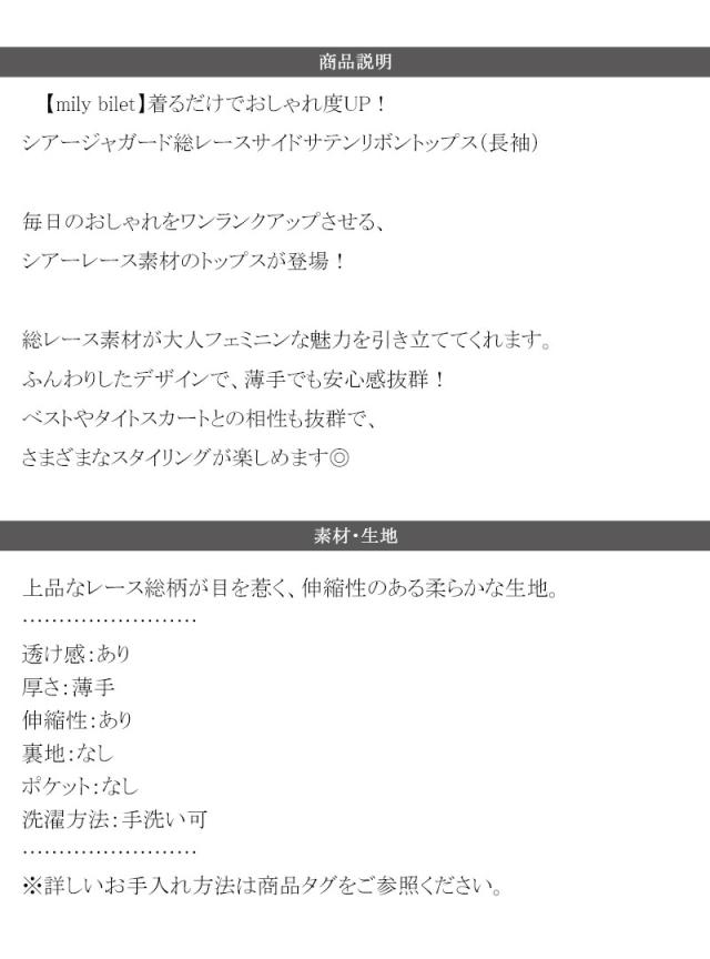 ★【mily bilet】着るだけでおしゃれ度UP!シアージャガード総レースサイドサテンリボントップス(長袖)★