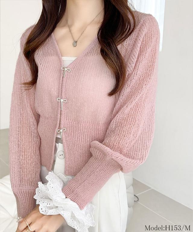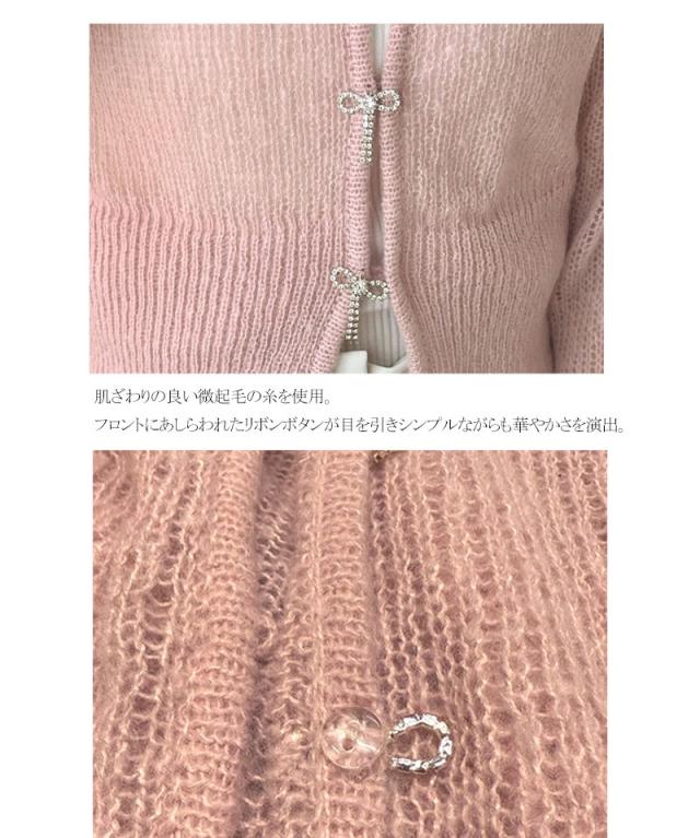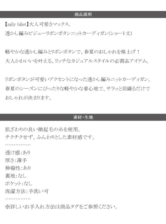 ★【mily bilet】大人可愛さマックス。透かし編みビジューリボンボタンニットカーディガン(ショート丈)★
