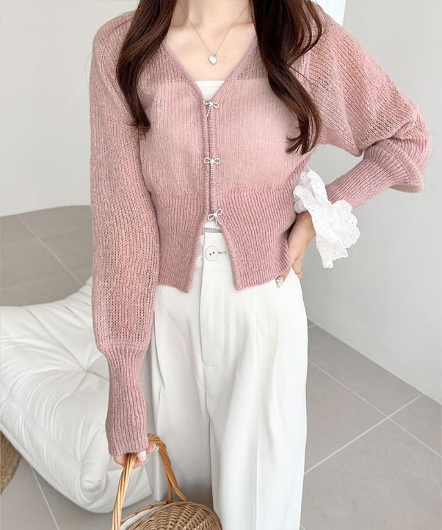 リボンボタンが可愛いアクセントになった透かし編みニットカーディガン。