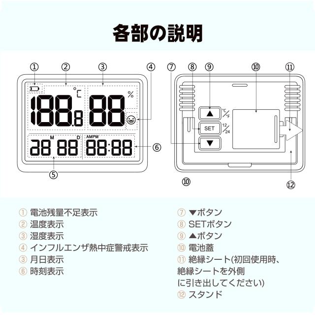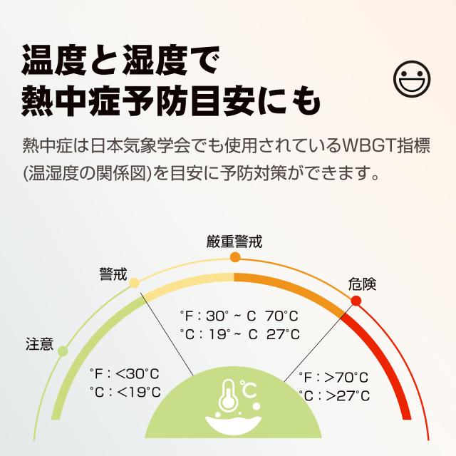 温度と湿度の関係性から、熱中症・インフルエンザの危険度目安を顔マークで表示します。デジタル 温湿度計の表情は3段階! 体感ではわかりにくくても表情をチェックするだけで室内環境を知ることができます。