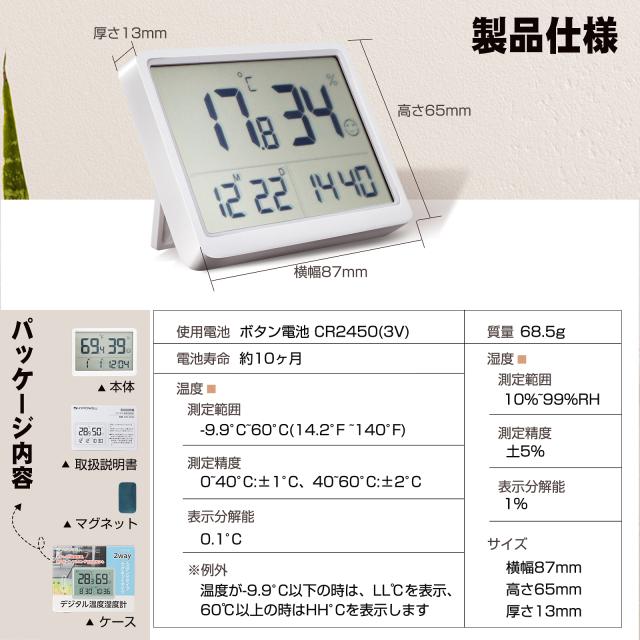 サイズ:約幅8.7×奥行1.3×高さ6.5cm;小さくて邪魔にならず、文字は見やすい大きさで、遠くからても確認しやすい温湿度計です。防水仕様ではないです。