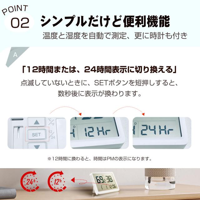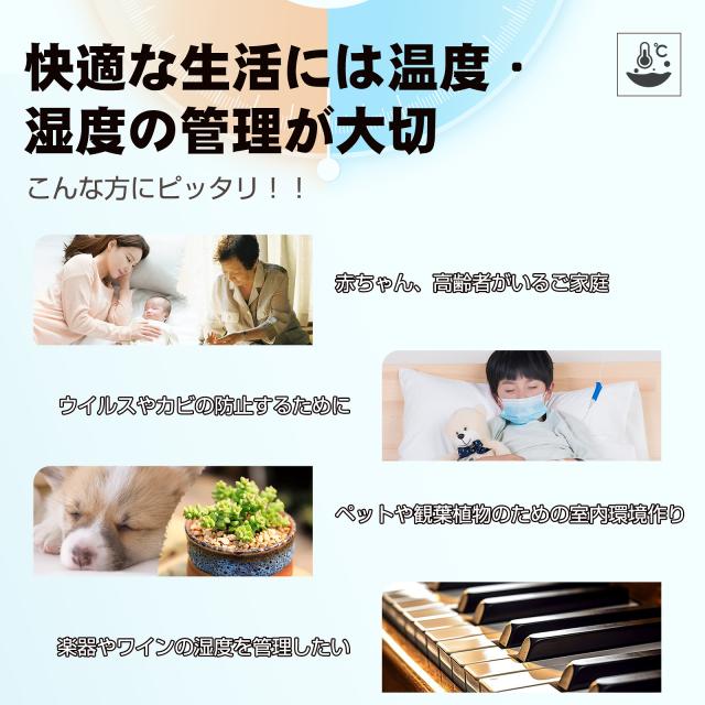 温度計と湿度計が一緒になっているから室内の空調管理がしやすく、赤ちゃんがいる家庭やペット(犬、猫、うさぎ、爬虫類など)のいる家庭におすすめです。梅雨のカビ対策やお肌の乾燥対策、赤ちゃんの健康管理、風邪対策など室温湿度計に関わるシーンで役立ちます。