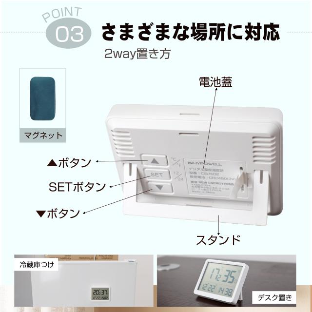 室温計はキッチンや寝室など室内のあらゆる場所で使いやすいように磁石(強力マグネット)、スタンドの2wayで使用ができます。マグネットで冷蔵庫につけたり、卓上で使ったりなど生活のシーンに合わせて設置ができます。