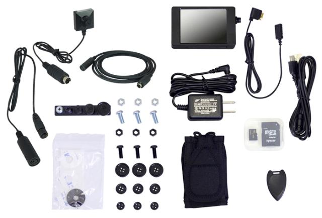 1.PMC-3L(カメラ部) 2.レコーダー接続ケーブル 3.延長ケーブル 4.偽装用(擬装用)レンズカバーセット 5.ダミーボタンネジセット 6.加工用ブラケット 7.両面テープ 8.PMC-7(レコーダー部) 9.有線リモコン 10.DC5Vスイッチングアダプター 11.microSDHCカード16GB(テスト用) 12.USBケーブル 13.ポーチ 14.スタイラスピック 15.取扱説明書兼保証書(写真非掲載)