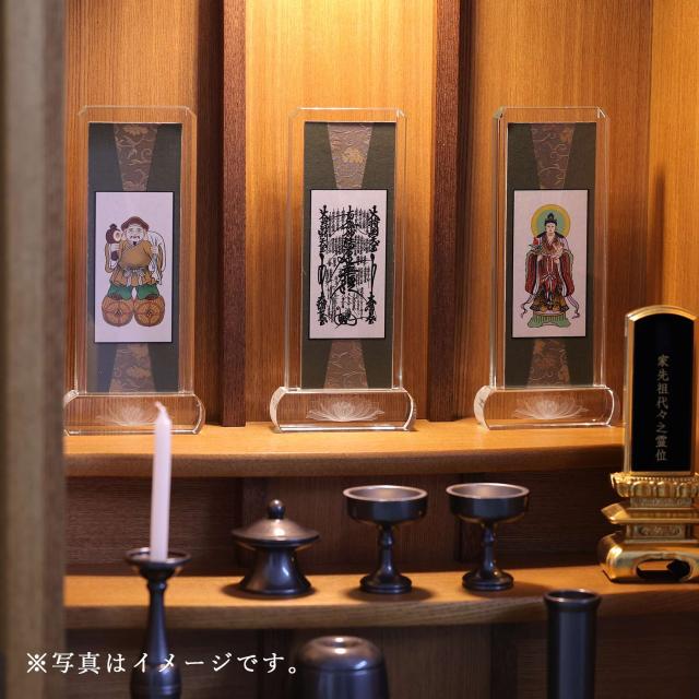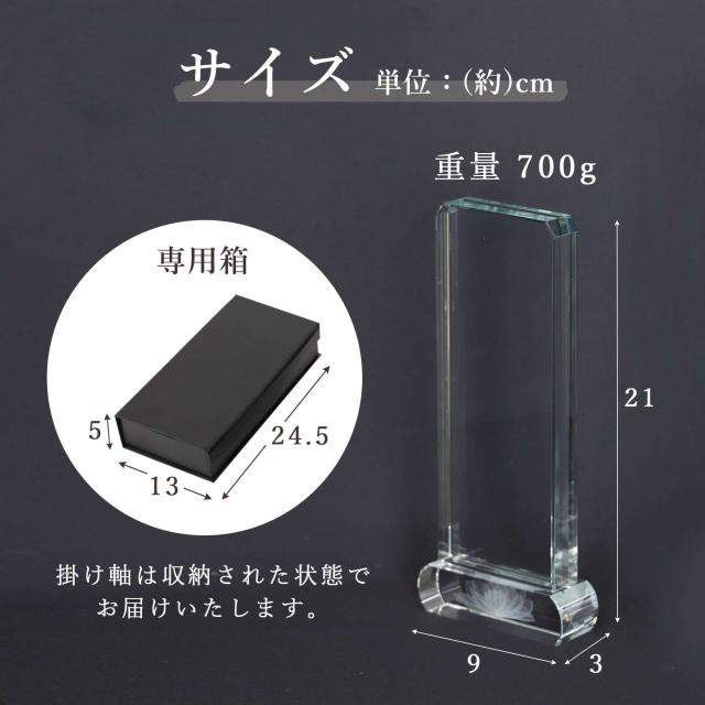 重厚感あふれるスタンド型デザインが特徴の、クリスタルガラス製掛軸です。本紙に描かれる繊細な絵像は和紙の縁取り、厳かな配色。お仏壇に置くだけで簡単に設置できるタイプです。