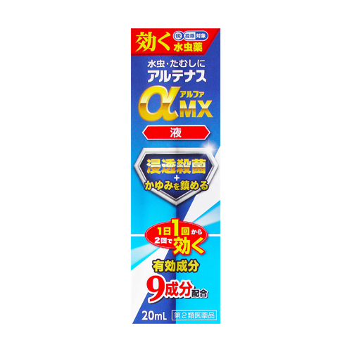 アルテナスαMX液は、ミコナゾール硝酸塩、ヒノキチオールが白癬菌の生育を阻止し、クロタミトン、リドカインが痛み・かゆみを速やかに抑えて、不快な水虫やたむしの症状を改善します。
