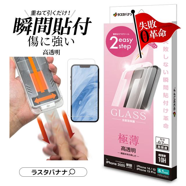 iPhone 16e iPhone14 13 Pro 13 ガラスフィルム 全面保護 高光沢 高透明 薄型 極薄 0.2mm 硬度10H 貼付革命 瞬間貼り 失敗しない瞬間簡単貼り付け レボリューション アイフォン 保護フィルム MTK4727IP5E ラスタバナナ