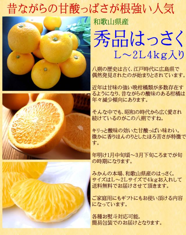 昔ながらの酸味が魅力!和歌山県産[秀品はっさく4kg] L~2Lサイズ 送料無料 八朔 ハッサク