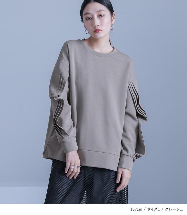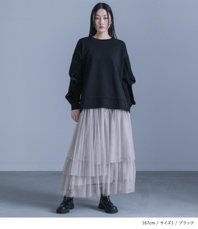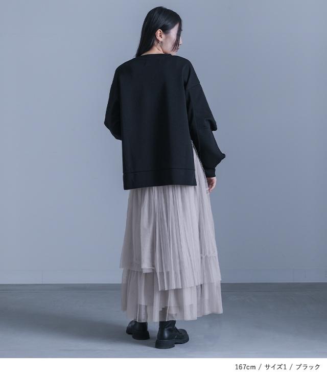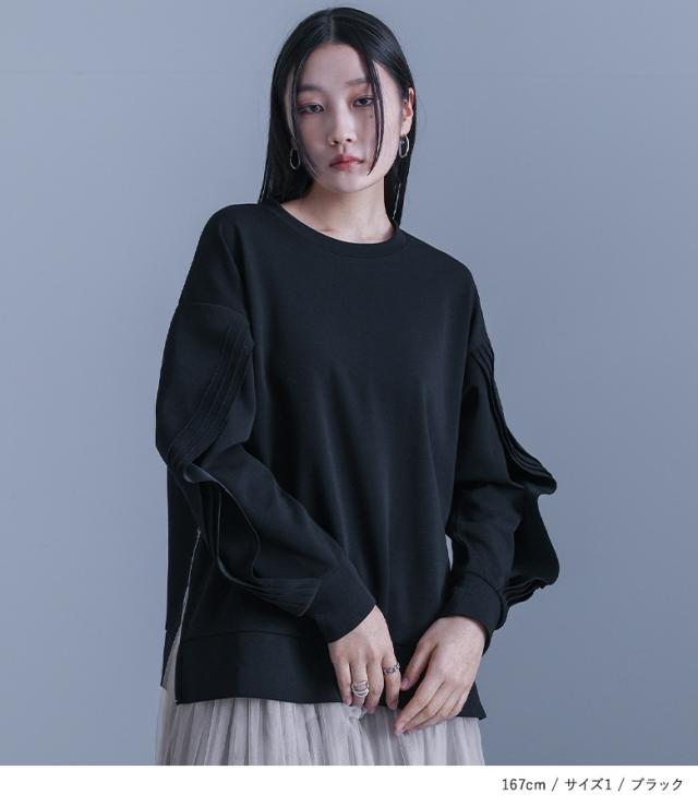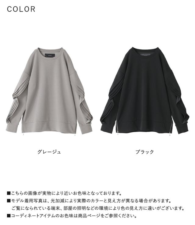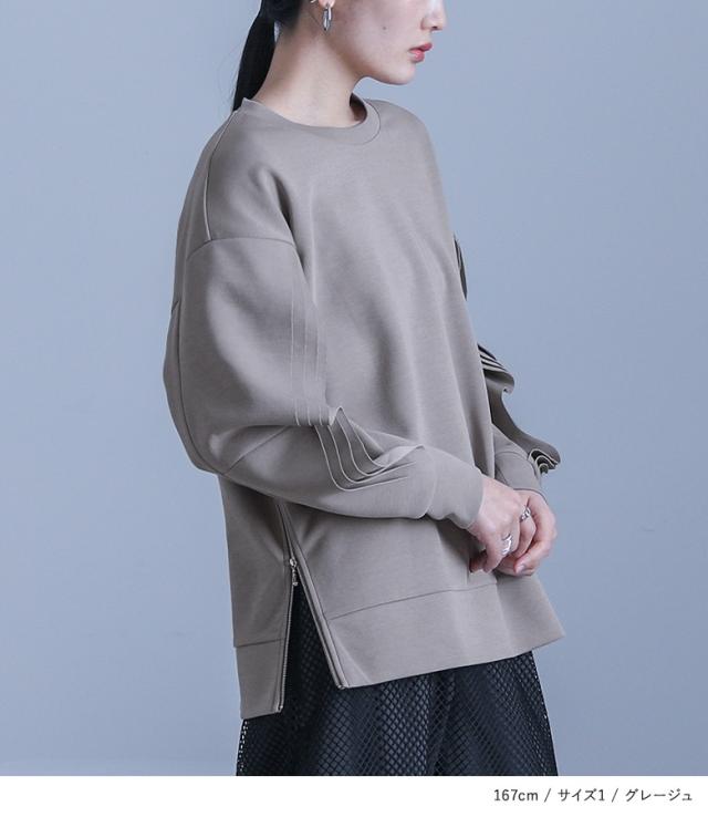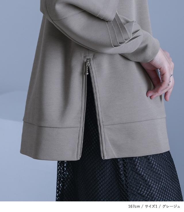 『サイドジップ袖フレアスウェット』【メール便不可】【20】[トップス レディース スウェット トレーナー 長袖 フレア袖 ファスナー スリット モード お尻が隠れる 体型カバー オシャレウォーカー]