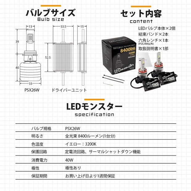 LED MONSTER L8400 LEDフォグランプキット 全光束:8400lm LEDカラー:イエロー 3200K バルブ規格:PSX26W |