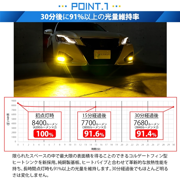 最強の明るさ8400ルーメン 55W ハロゲンランプの明るさ2200Lm(※1)を超える十分な光量です。 全光束8400ルーメン(※2)、最強のモンスター級フォグランプ用LEDバルブキットです。 (※1)自社調べ (※2)ルーメン値は、左右バルブ2個(車両一台分)の合計値を示しています。 30分後に91%以上の光量維持率 放熱性能が高いため、長時間点灯後も91%以上の光量を維持します。30分経過後でもほとんど明るさは変化しません。 抜群の配光特性 最新の超小型パワーLEDを搭載。 純正球の配光特性に徹底的にこだわり、純正バルブのフィラメントと中心を合わせた同じ位置にLEDの発光源を設定。LEDが実装された基板の厚みはわずか2.8?。理想的な配光を実現しています。 進化した放熱システム コルゲートフィン型ヒートシンクにより放熱性能が大幅アップ! LEDで発生した熱を効率よく放熱します。 1)純銅製基板 LEDを実装した極薄純銅製基板。LEDで発生した熱を素早く取り込みヒートパイプに伝えます。 2)純銅製ヒートパイプ 空洞で真空密閉されたヒートパイプ。銅板よりも熱伝導性に優れ、銅製基板の熱をヒートシンクに素早く確実に伝えます。 3)コルゲートフィン型ヒートシンク ヒートシンクは表面積が大きいほど冷却スピードが向上します。限られたスペースの中で最大限の表面積を得るため、A6063アルミ合金を薄く蛇腹状にしたコルゲートフィン型ヒートシンクを搭載。ヒートパイプから送られてくる熱を素早く放熱します。 4)高性能ファン 直径30mmの高性能ファンを搭載。最大直径33mmの細身の筒型アルミバルブケース内で気流を起こし、コルゲートフィンに大量の空気を当てて素早く熱を奪います。 定電流回路搭載 定電流回路を搭載し突発的な車両電圧変化に影響されることなく安定した点灯を確保します。ハイブリッド車(HV車)にも安心してご使用いただけます。 サーマルシャットダウン機能 バルブに搭載したファンが故障しバルブの冷却ができなくなった場合や、動作周囲温度が設定値を超えた場合等の非常事態には出力を下げてLEDバルブや車両の破損を防ぎます。 角度調整機構 バルブの爪の角度調整が出来る機構を搭載。フォグユニットのリフレクター形状に合わせ、最適な照射角度の調整が可能です。 両側ロック対応カプラー 本製品は極性がありますので、取付け時に点灯しない場合はカプラーを180度変えて再度接続しなおしてください。どちら側でもロックができます。 |