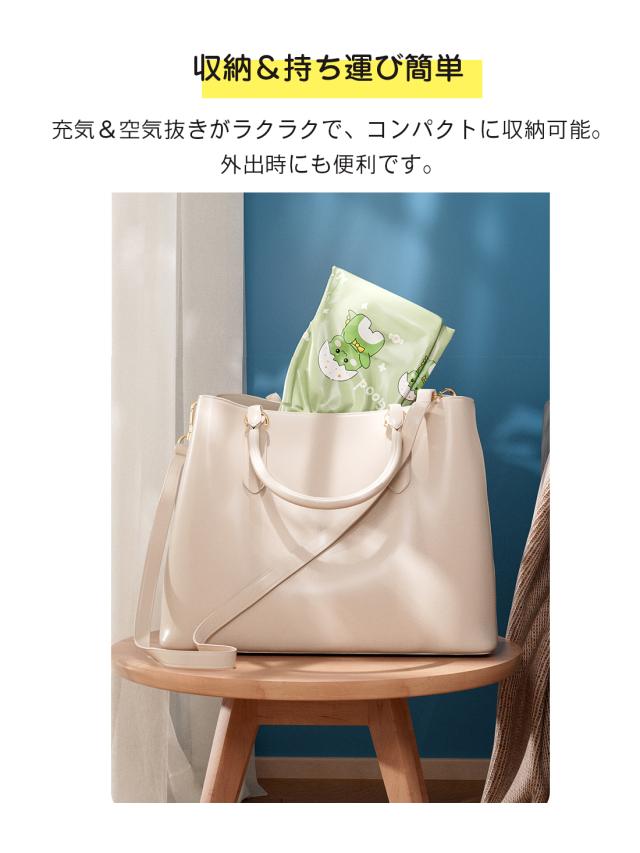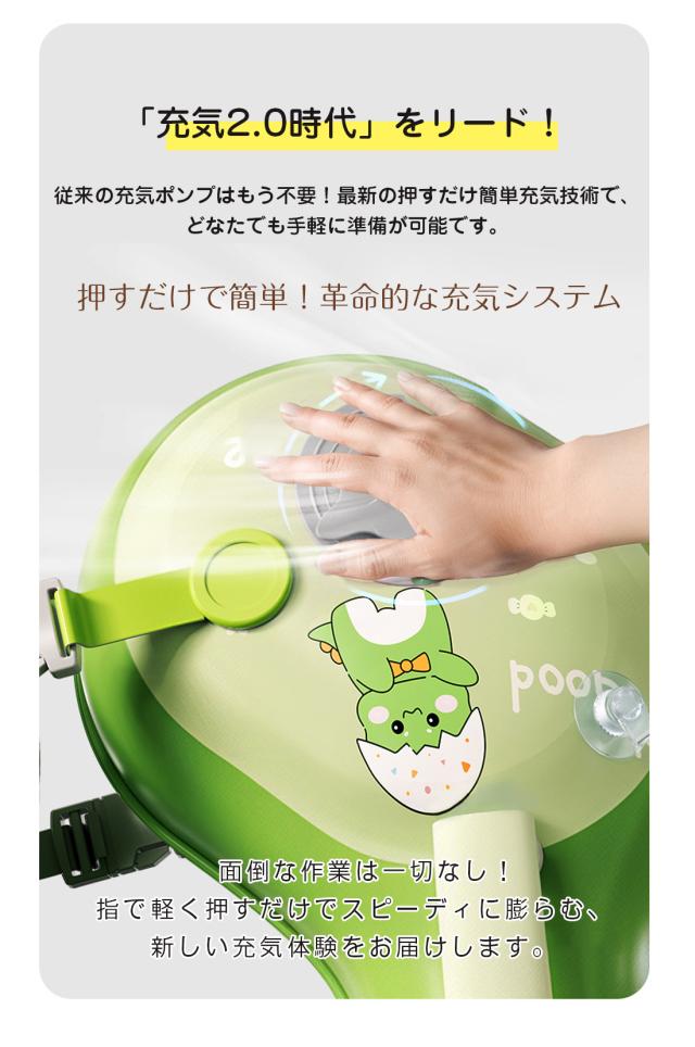 押すだけで空気入れをいれることができる新開発浮き輪。毎回空気入れを探す手間を省き、かさばらずどこでも携帯することができます。