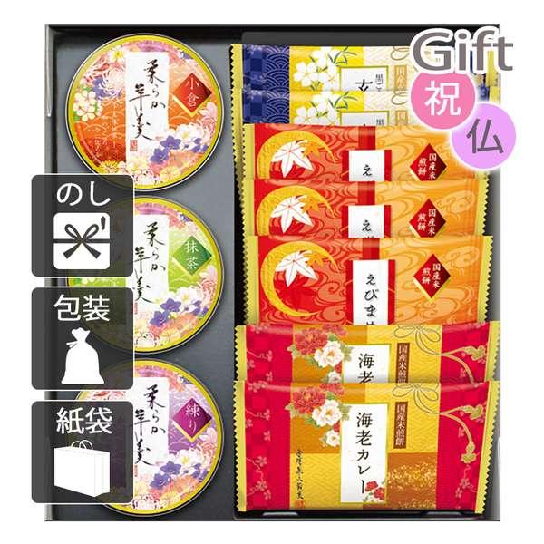 内容/えびまめ花煎餅×3、黒ごま入り玄米煎餅×2、海老カレー×2、柔らか羊羹(小倉・練り・抹茶)各60g×各1