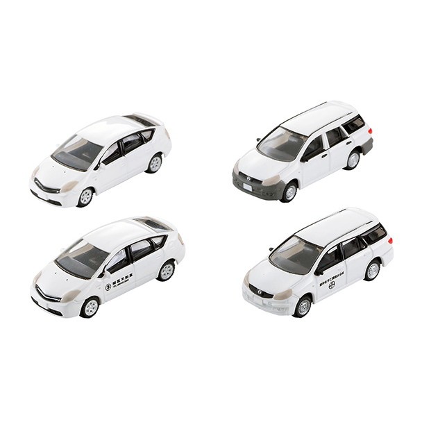 ビジネスカー 白は街でよく見かけるトヨタ プリウスと日産 ADバン/ADエキスパートのセットで、社名ロゴの有無をそれぞれ1台ずつ収録、リアルな街の情景の再現が手軽にできるアイテムです。