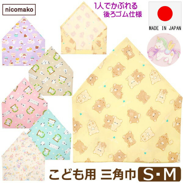 三角巾 子供 ゴム付き 日本製 女の子 S M ユニコーン スイーツ クマ シマエナガ k1063 nicomako ニコマコ ネコポス便は送料無料 キッズ ジュニア ゴム 被りタイプ 自分でかぶれる 着脱簡単 給食 調理 幼稚園 小学生 小学校 入園 入学 4k2