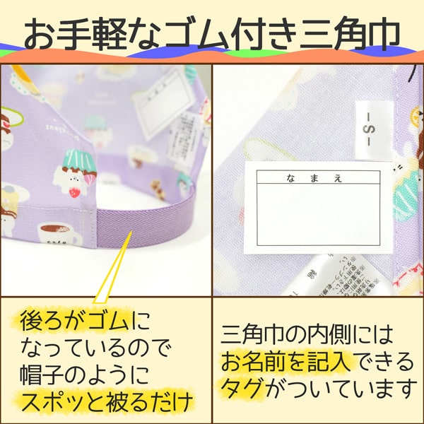 | 商品説明 | ※安心、安全な日本製はもちろん、裁断から縫製、検品、仕上げまで全て日本にて行っております。綿100%素材でお子様にも安心。 ※保育園・幼稚園や小学校で活躍するゴム付き三角巾♪ ※内側にはお名前を記入できるタグ付き。 ※後ろがゴムになっているので、帽子のようにスポッと被るだけでOK! |