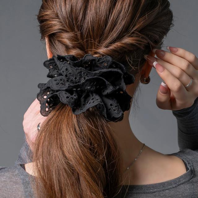 【ゆうパケットOK】 シュシュ ヘアゴム コットン レース 立体感 タック フリル 大きめ ボリューム 大人 軽い ヘアアクセサリー 髪留め まとめ髪 大人 ブラック outlet