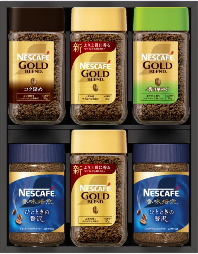 商品内容:ゴールドブレンド80g×2、ゴールドブレンド コク深め80g×1、ゴールドブレンド 香り華やぐ80g×1、香味焙煎 ひとときの贅沢65g×2
