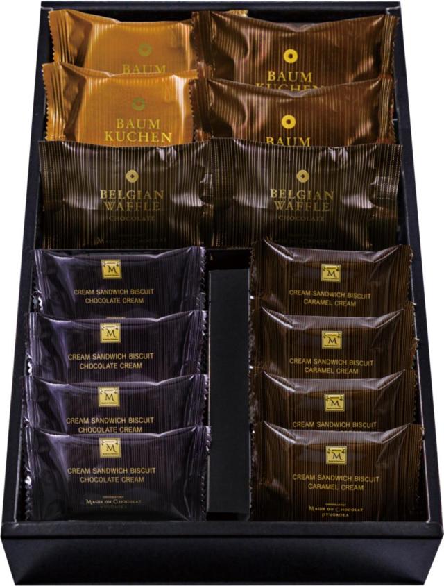 商品内容:ベルギーワッフル(ショコラ)×2個、バームクーヘン(ショコラ・ミルク)×各2個、クリームサンドビスケット(ショコラ・キャラメル)×各4個