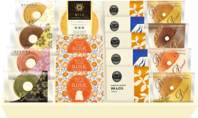 商品内容:タリーズドリップコーヒー(ブラジル×3袋・キリマンジャロ×2袋)、ミニバウムクーヘン(バナナ・ベルギーショコラ・桜・宇治抹茶)×各1個、ベイクドドーナツ(プレーン×2個、ストリベリー・ショコラ×各1個)、ミルクバウムクーヘン×1個、シュガーラスク(2枚入)×3個