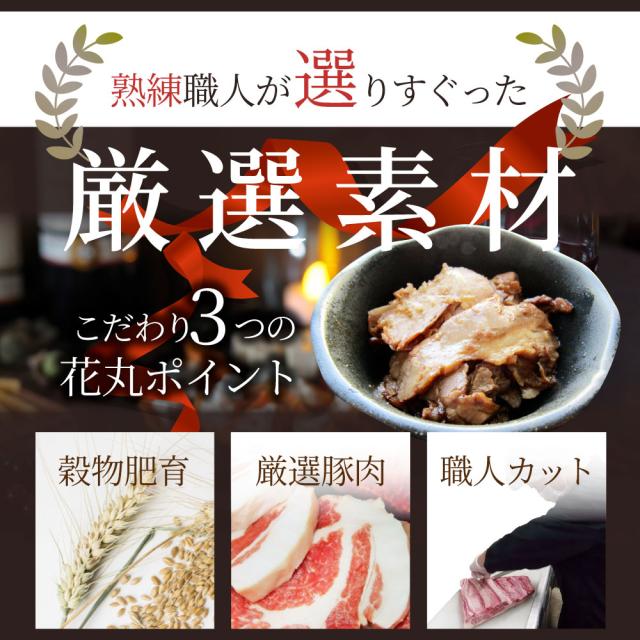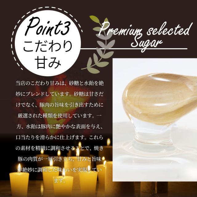 原材料 :豚ばら肉(スペイン)、糖類(水あめ、砂糖、ふどう糖)、しょうゆ、食塩、植物性たん白、ニンニク、甜面醤、ビーフエキス、ポークエキス、酵母エキス/着色料(カラメル)、酸味料、酸化防止剤(ビタミンC、ビタミンE)、(一部に小麦・牛肉・大豆・豚肉・ごまを含む)