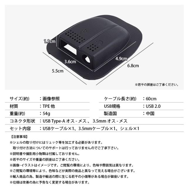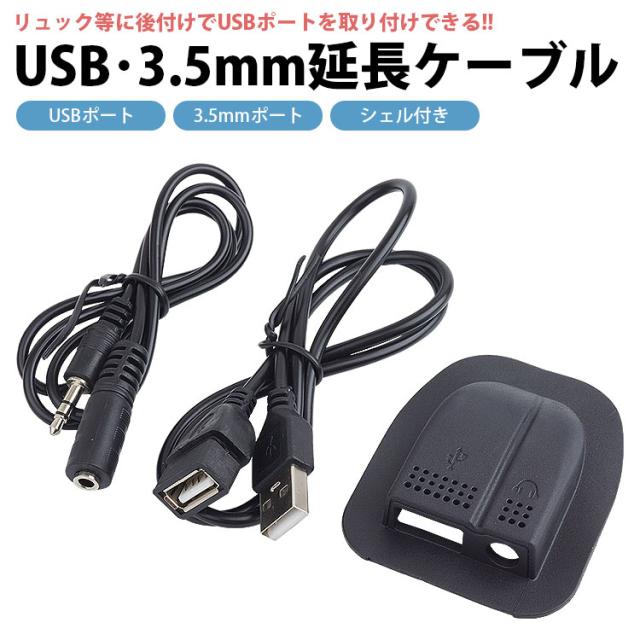 USB延長ケーブル USBポート 後付け 3.5mm シェル付き リュック カバン バックパック USB 3.5mm 延長 ケーブル 約60cm 充電 イヤホン端子 外部接続 外付け PR-CONEUSB01【メール便 送料無料】