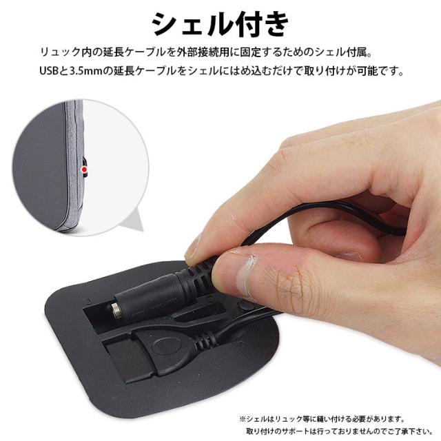 リュック内の延長ケーブルを外部接続用に固定するためのシェル付属。