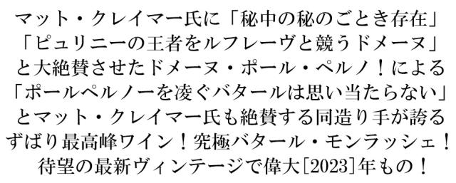 マット・クレイマー氏に「秘中の秘のごとき存在」 「ピュリニーの王者をルフレーヴと競うドメーヌ」 と大絶賛させたドメーヌ・ポール・ペルノ!による 「ポールペルノーを凌ぐバタールは思い当たらない」 とマット・クレイマー氏も絶賛する同造り手が誇る ずばり最高峰ワイン!究極バタール・モンラッシェ! 待望の最新ヴィンテージで偉大[2023]年もの!