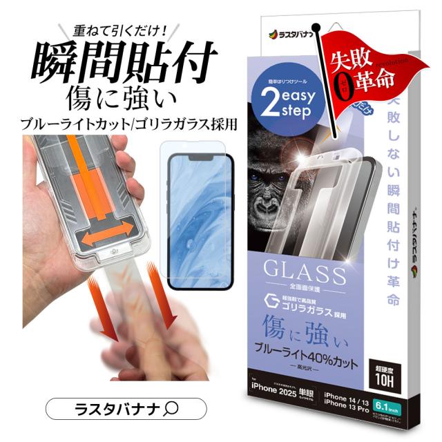iPhone 16e iPhone14 13 Pro 13 ガラスフィルム 全面保護 ブルーライトカット 高光沢 ゴリラガラス採用 0.33mm 硬度10H 貼付革命 瞬間貼り 失敗しない瞬間簡単貼り付け レボリューション アイフォン 保護フィルム MTK4734IP5E ラスタバナナ