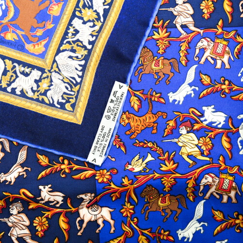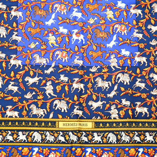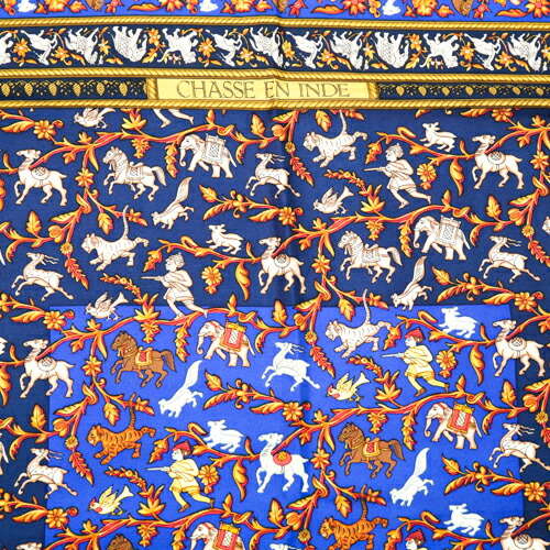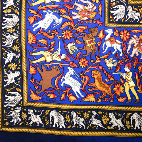 エルメス HERMES スカーフ カレ90 シルク CHASSE EN INDE インドの狩猟 動物 ゾウ トラ 民族柄 ショール 大判 レディース メンズ 紺 青 マルチカラー ネイビー ブルー オレンジ 美品 中古 p2021521