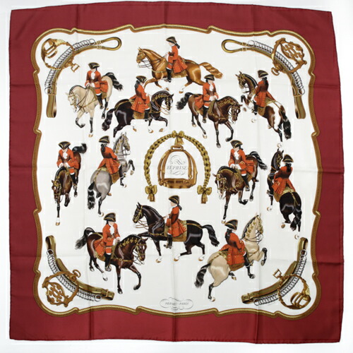 スカーフ カレ90 シルク REPRISE 乗馬風景 馬 リピート 馬柄 バンダナ 大判 ショール ストール レディース メンズ ユニセックス 赤 白 ワインレッド ホワイト マルチカラー