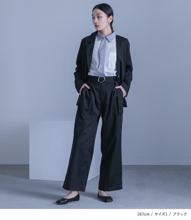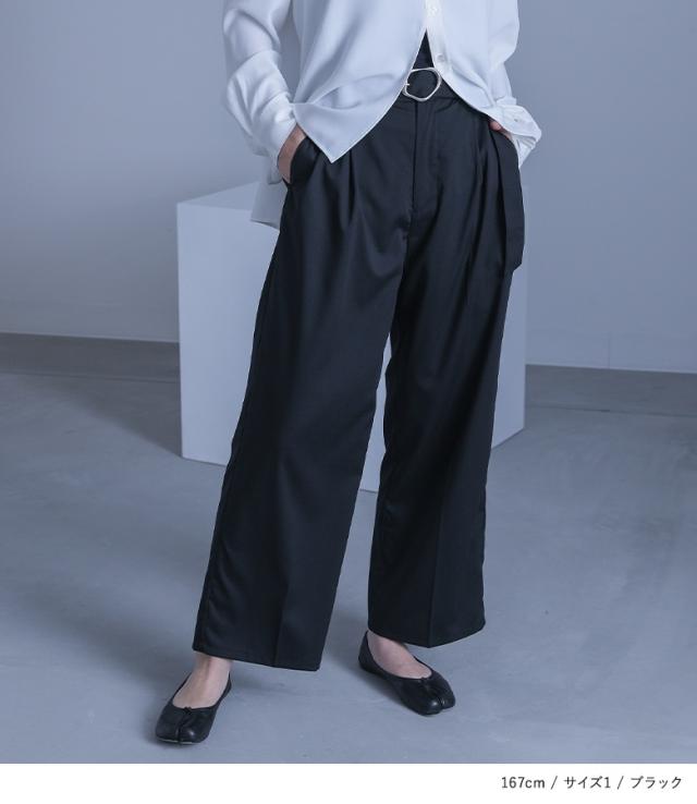 『変形ベルトバックルタックパンツ』【メール便不可】【20】[パンツ レディース ボトムス ワイドパンツ ズボン 長ズボン ストレート スーツ生地 ベルト バックル タック モード オシャレウォーカー]
