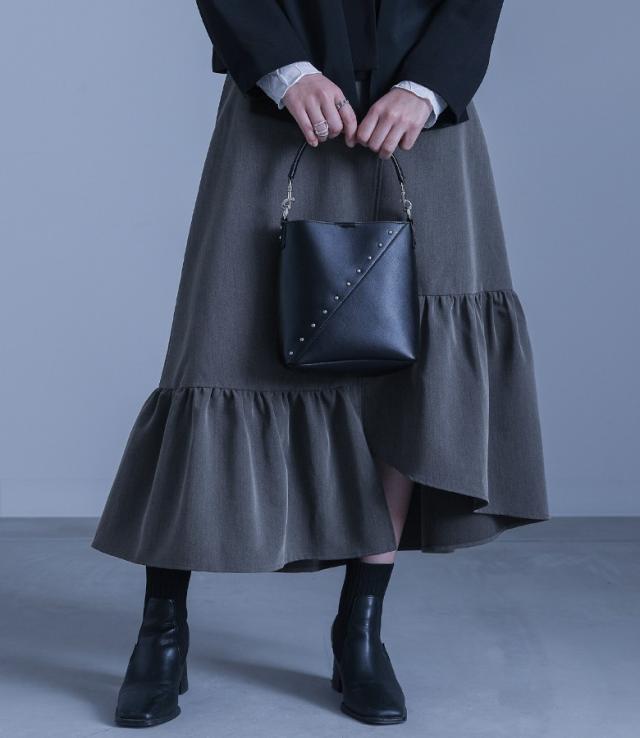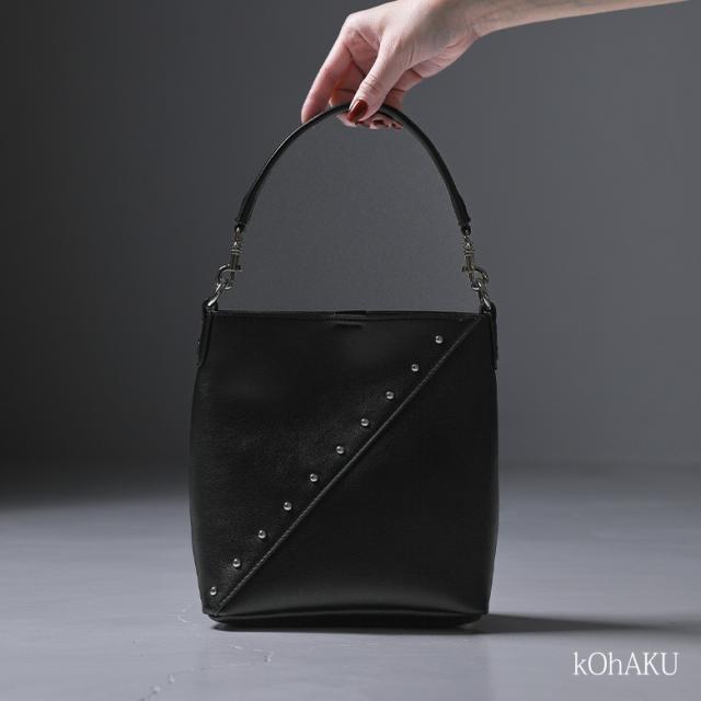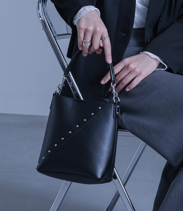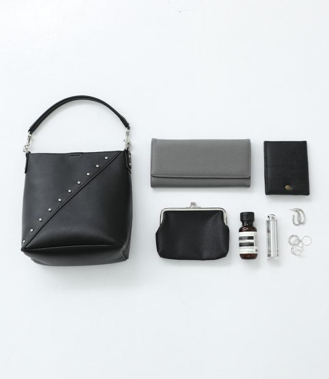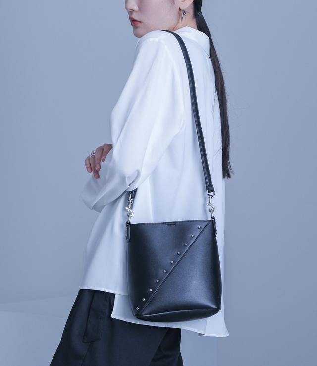 ■デザイン 斜めに施されたシルバーのスタッズがアクセントになった、小さめながらも長財布が入るサイズ感のバッグ。ショルダーベルトは取り外し可能な仕様で、ハンド持ちにもショルダー持ちにも対応できます。 ■ディティール ・マチ有り ・外側ポケット ■コーディネート シンプルなスタイルに合わせるだけでモードな雰囲気に導くデザインバッグ。様々なアイテムに合わせることができますが、モノトーンコーデに合わせることでより一層スタイリッシュな印象が叶います。 ■素材 本来は破棄する革の破片やくずなどを集めて再加工し、レザーにアップサイクルしたリサイクルレザー。本革に近い風合いで、環境に優しい素材です。" |