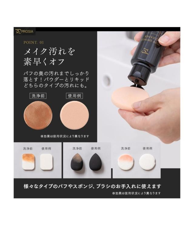 いつものパフやスポンジを清潔に保ちたいあなたへ シリーズ累計190万個の実績ブランド、プロシアのパフ・スポンジ用クリーナー メイクアップの仕上がりを左右するパフやスポンジ。 清潔に保つことで、より美しい仕上がりを実現できます。 本製品は、パフやスポンジの汚れをしっかり落とす、専用クリーナーです。
