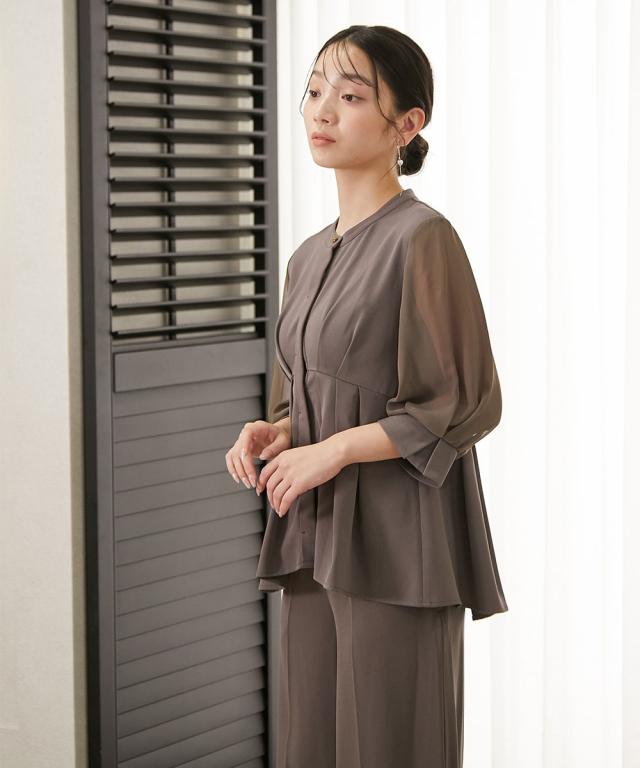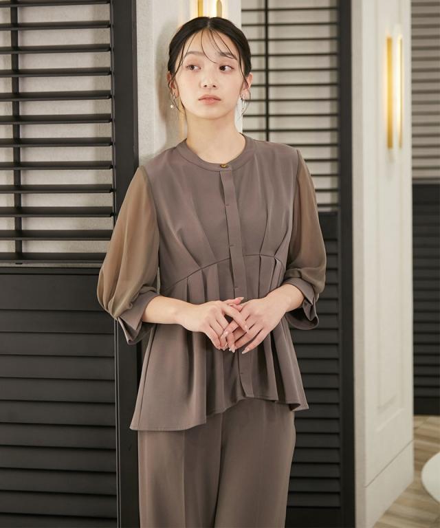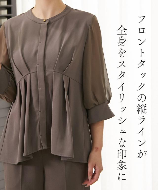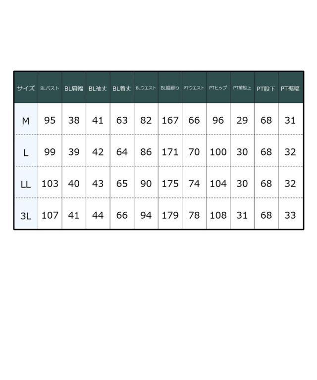 品質=ポリエステル95%・ポリウレタン5% [別地]ポリエステル100% 裏地無 ブラウス:前ボタン開 パンツ:脇ファスナー開 ウエスト後ゴム入 ポケット右脇1