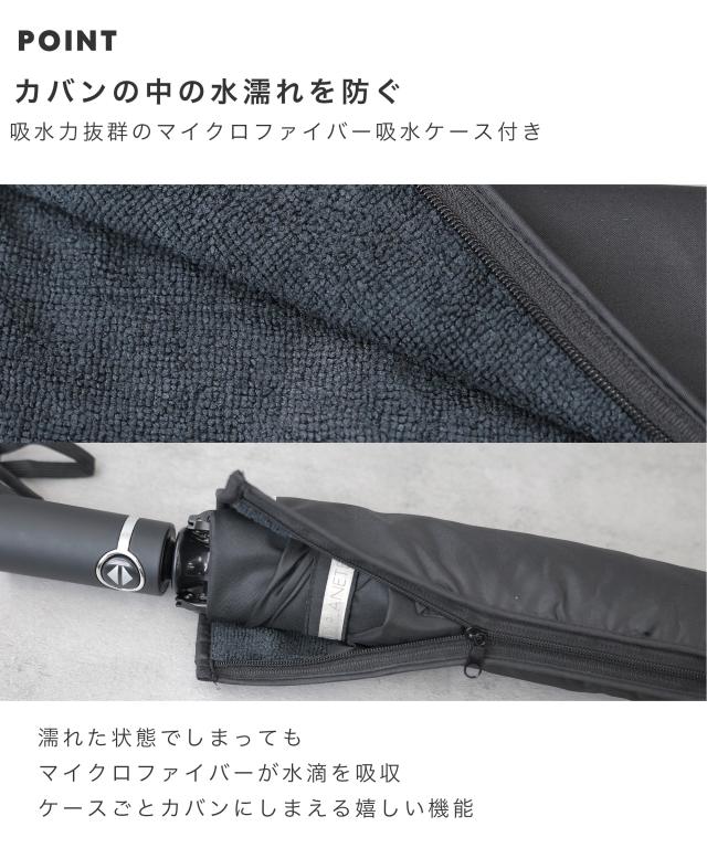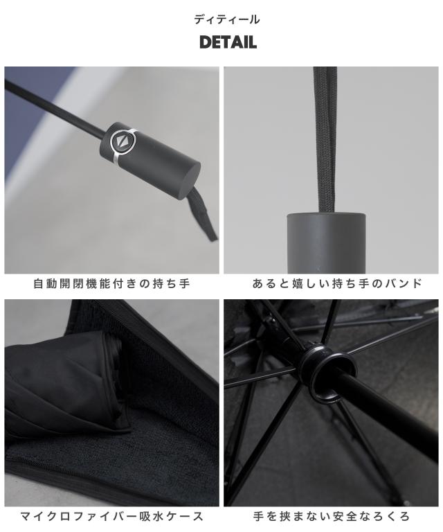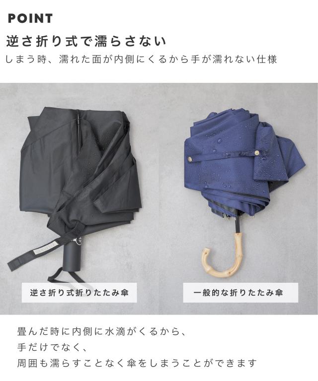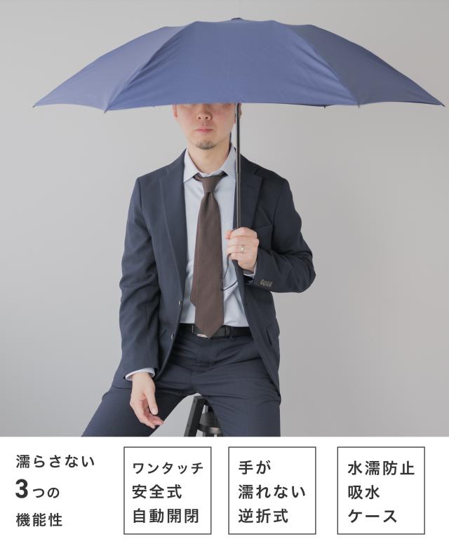 濡らさない メンズ折りたたみ傘 ワンタッチ自動開閉と、逆折り式、吸水ケース。濡れない機能性 point1 ワンタッチで自動開閉。使う時もしまう時もボタンひとつで。 車の乗降時や、片手が塞がっている時でもボタンを押すだけでスマートに傘を使うことができます。 point2 逆さ折りで濡らさない しまう時、濡れた面が内側にくるから手が濡れない仕様 畳んだ時に内側に水滴がくるから、手だけでなく周囲も濡らすことなく傘をしまうことができます。 point3 カバンの中の水濡れを防ぐ 吸水力抜群のマイクロファイバー吸水ケース付き。 濡れた状態でしまってもマイクロファイバーが水滴を吸収 ケースごとカバンにしまえる嬉しい機能性。 カラーはブラック・ネイビーの2色展開。 普段使いはもちろんのこと、ビジネスシーンにもおすすめの落ち着いたデザイン |