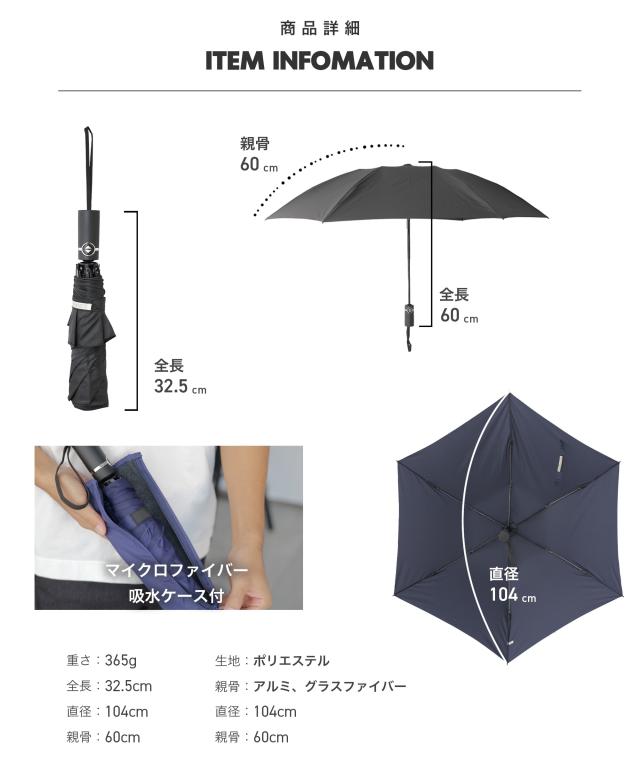 重さ:365g 全長:32.5cm 直径:104cm 親骨:60cm |