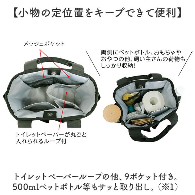| 商品説明 | 【365日、愛犬と楽しくお散歩】 ・飼い主さんの、お散歩時の負担を軽減する機能を詰め込んだ「ワンかるお散歩トート」。 【お好みに合わせてスタイルチェンジ】 ・手持ちではもちろん。幅広ショルダーを取り付けて、肩掛けや斜め掛けも自在な2way。 【マグネットボタンでワンタッチ開閉】 ・力いらずで簡単◎出し入れしやすく、閉じれば中身のこぼれ落ちもガード。 【お散歩の必需品がひとまとめ】 ・コンパクトに見えてマチをしっかり。ワンちゃんのお散歩グッズも、飼い主さんの荷物も収納。 【小物の定位置をキープできて便利】 ・トイレットペーパーループの他、9ポケット付き。500mlペットボトル等もサッと取り出し。 (※1)バッグ本体のみで9ポケット仕様となります。 【夜間にも役立つリフレクターフック】 ・小物を吊り下げできるフックを配置。暗闇でヘッドライトの光を反射するリフレクター付き。 【カラビナで着脱!マナーポーチ】 ・片手で開閉できるバネ式ポーチ。可愛い骨型カラビナで、装着も手間取らない◎ 【マナー袋もサクッと用意できる】 ・マナーポーチの前面にはポケットを1つ。下からマナー袋を取り出せるつくり。 【軽やかな使い心地で疲れにくい】 ・サッと持ち出せて、体に負担をかけない軽量設計。ワンちゃんと沢山お散歩しても大丈夫◎ 【不意の雨にも対応できて丈夫な質感】 ・900Dポリエステル素材に、汚れや水滴を弾きやすい撥水加工を。お手入れも拭き取るだけ。 (※2)完全防水ではありません。 【抗菌防臭加工でいつも清潔】 ・内装生地に加工を施すことで、バッグ内の気になるニオイを軽減。ニオイの元となる菌もガード。 【家族でシェアもできる優秀アイテム】 ・持つ人を選ばないカラーとデザイン。機能面も充実した、頼れる相棒! 【ポケット仕様】 ・内側:メッシュポケット×2、オープンポケット×2、トイレットペーパーループ×1 ・前面:オープンポケット×2 ・サイド:オープンポケット×2 ・背面:ファスナーポケット×1 ・マナーポーチ:フロントマナー袋用ポケット×1 |