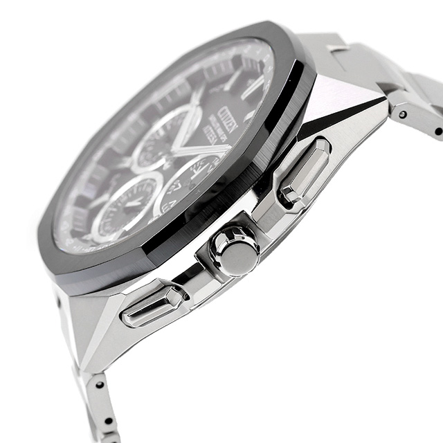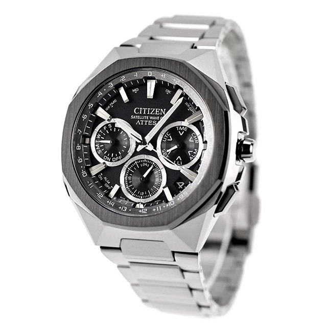 正規品 7年保証キャンペーン 送料無料 シチズン アテッサ ダブルダイレクトフライト チタン クロノグラフ ソーラー 日本製 エコドライブ エコ・ドライブ メンズ 腕時計 CC4104-53E CITIZEN ATTESA ACT Line アナログ ブラック 黒 ◆チタニウムで次世代を進み続ける、シチズン ATTESA(アテッサ)。エコ・ドライブGPS衛星電波時計の最上位ムーブメント「F950」を搭載したACT Lineから、八角形のセラミックベゼルを採用し、今までと何もかもが違うルックスに仕上げた新作が誕生しました。チタニウムでは表現が難しい、極めて粗いヘアラインを施したセラミックス製のベゼルを搭載。異素材を組み合わせたスタイリングがソリッドで精悍な印象を与えます。高度なチタニウム加工技術をいかし、八角形ベゼルの頂点とケースの稜線を合わせたフルフローの美しいルックス。“X-Type”とも呼ばれるケース形状は、「X-8 クロノメーター」から着想を得ました。 発売日:2025年3月発売