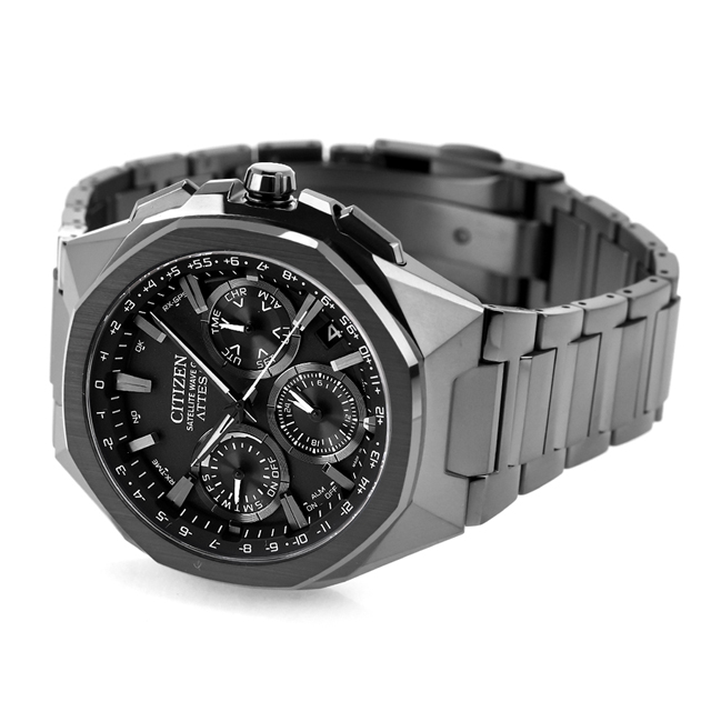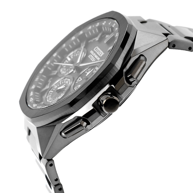 正規品 7年保証キャンペーン 送料無料 シチズン アテッサ ダブルダイレクトフライト チタン クロノグラフ ソーラー 日本製 エコドライブ エコ・ドライブ メンズ 腕時計 CC4105-69E CITIZEN ATTESA ACT Line Black Titanium Series アナログ オールブラック 黒 ◆チタニウムで次世代を進み続ける、シチズン ATTESA(アテッサ)。エコ・ドライブGPS衛星電波時計の最上位ムーブメント「F950」を搭載したACT Lineから、八角形のセラミックベゼルを採用し、今までと何もかもが違うルックスに仕上げた新作が誕生しました。チタニウムでは表現が難しい、極めて粗いヘアラインを施したセラミックス製のベゼルを搭載。異素材を組み合わせたスタイリングがソリッドで精悍な印象を与えます。高度なチタニウム加工技術をいかし、八角形ベゼルの頂点とケースの稜線を合わせたフルフローの美しいルックス。“X-Type”とも呼ばれるケース形状は、「X-8 クロノメーター」から着想を得ました。 発売日:2025年3月発売