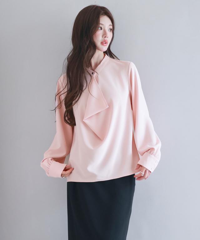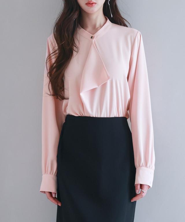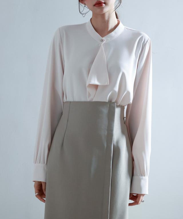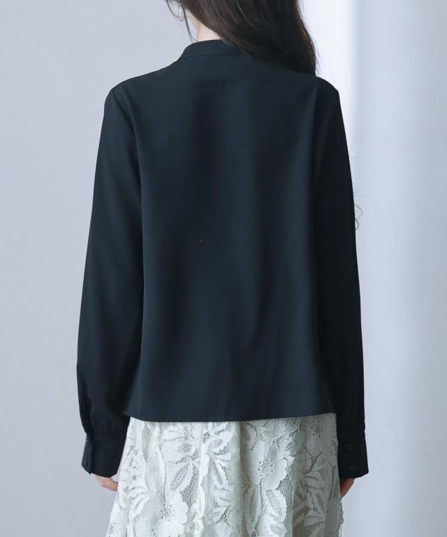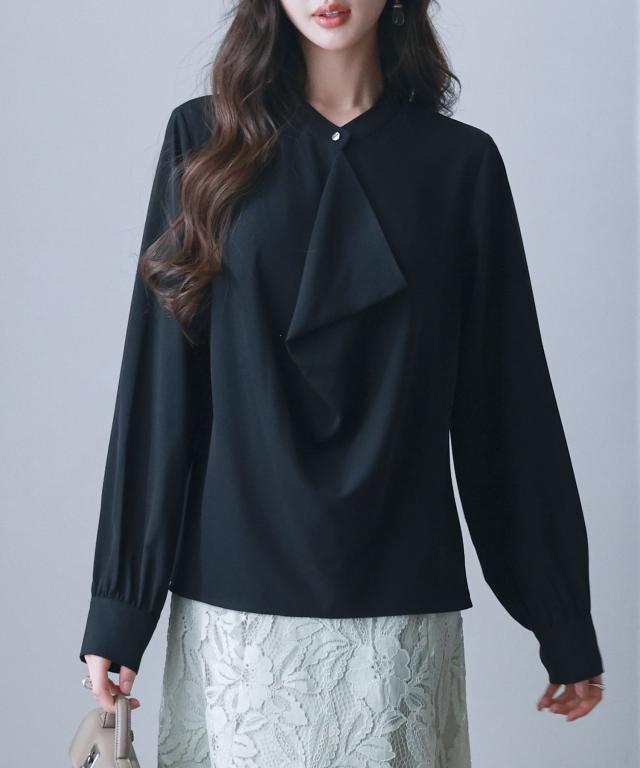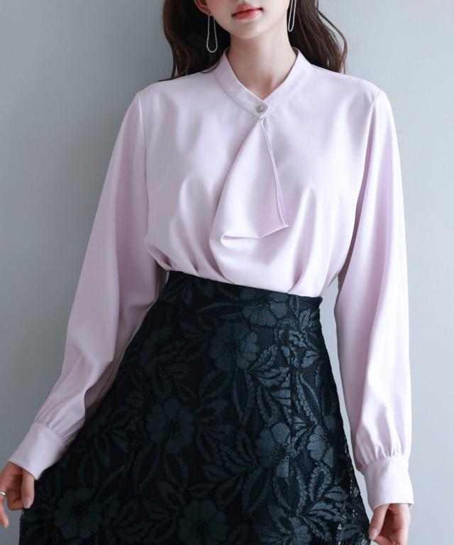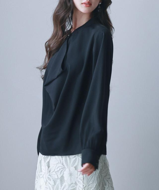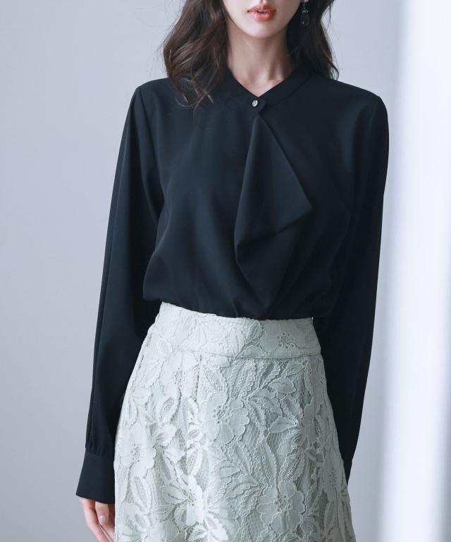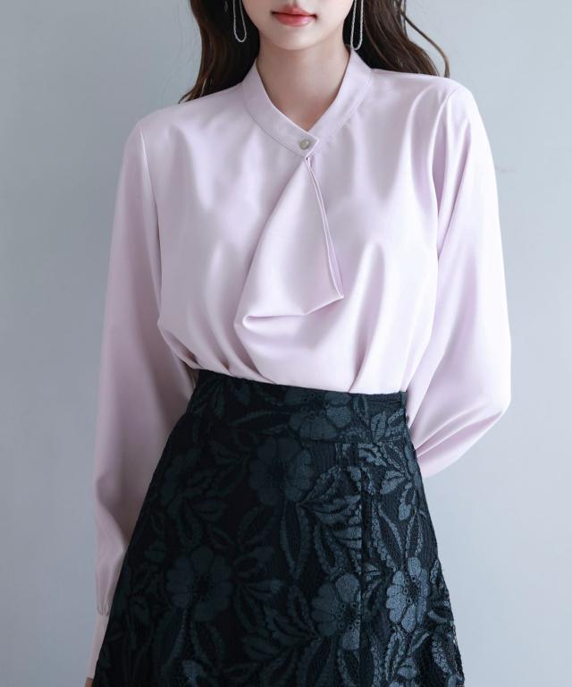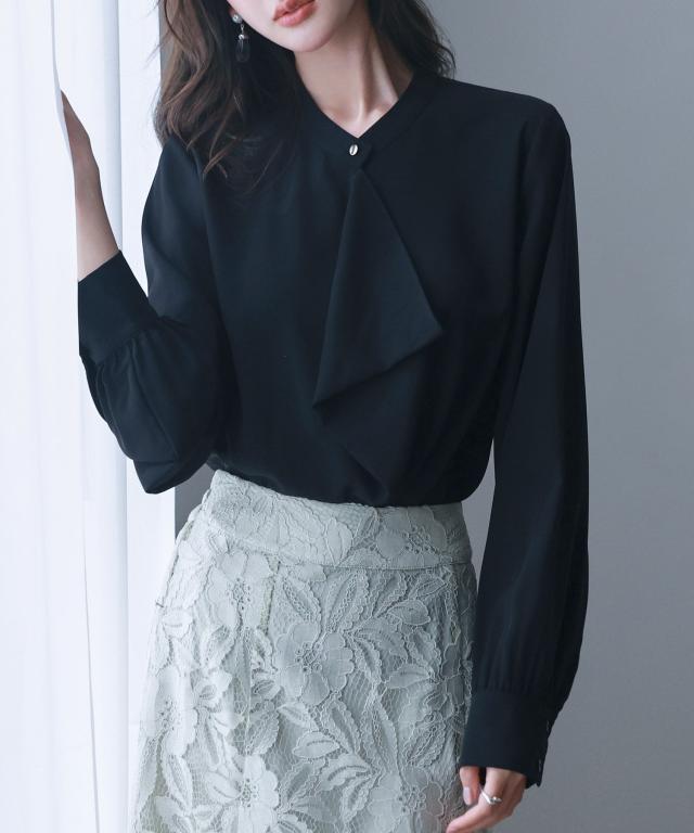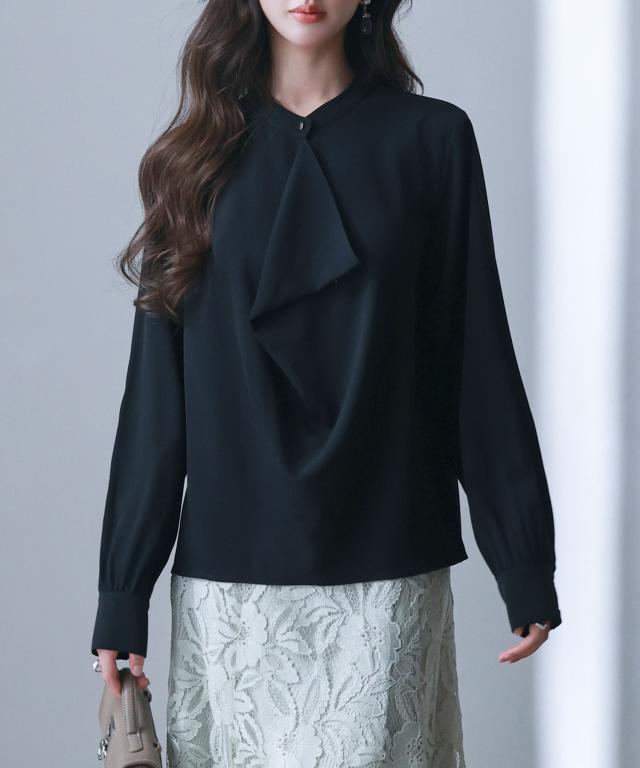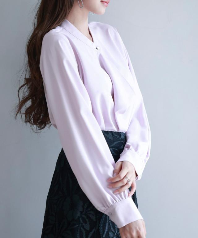 胸元フリルと金ボタンが上品映えするとろみ生地ブラウス。