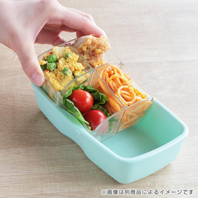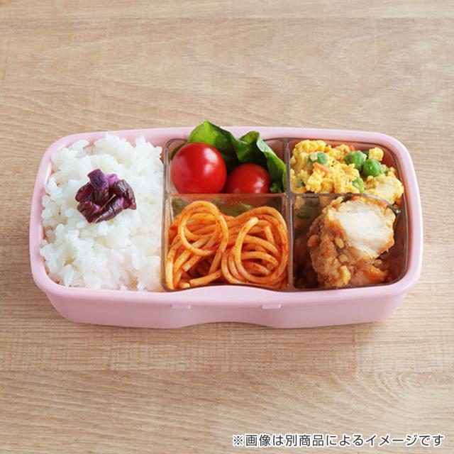 付属のおかず入れは4つに区切られています。ご飯やおかずの味が混じることがなく美味しいお弁当が楽しめます。女性が好むお弁当の理想の区切り方アンケートを行い、一番多く要望のあった形を採用しています。
