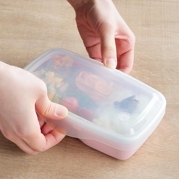 蓋はレバーレスで、「ロック部分を無理に開けて壊れてしまう」「落としたら簡単にロックが外れてしまう」というレバー付きお弁当箱の不安が解消されています。蓋の側面を広げると簡単に開けられ、閉める時は押し込むだけでカチッとロックされます。