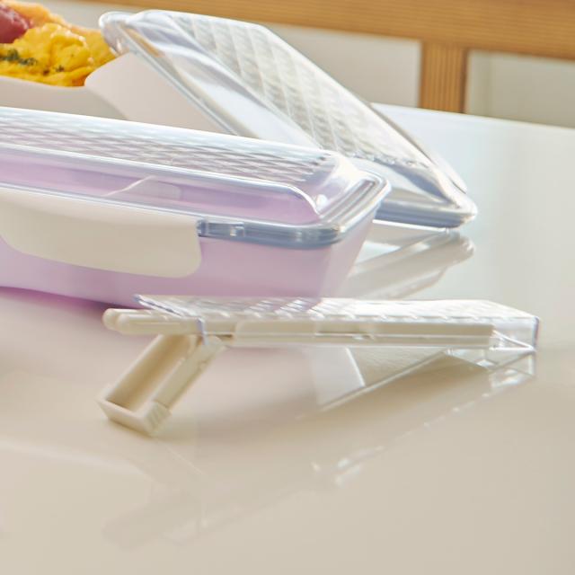 箸箱を少しスライドすると引き出した部分が下に折れ曲がり、お箸が取り出しやすい構造になっています。折り曲がる部分は10万回の耐久テスト済みなので安心してお使いいただけます。