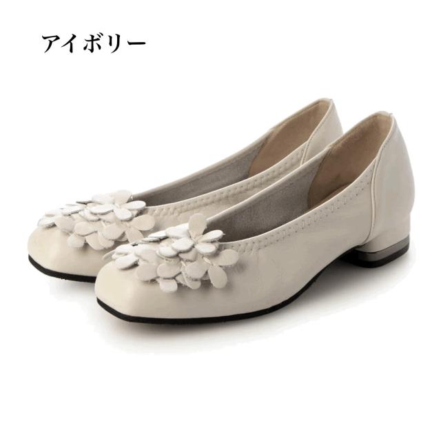 日本製 本革 レザーパンプス フラワーデザイン 柔らかレザーコンフォート ローヒールパンプス 幅広 3e 外反母趾 カジュアル かわいい おしゃれ 履きやすい 歩きやすい 疲れにくい