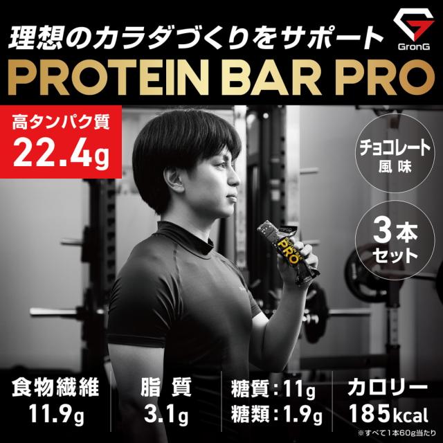 グロング プロテインバー PRO 高タンパク質 22.4g チョコレート風味 3本セット 食物繊維 ビタミン ミネラル