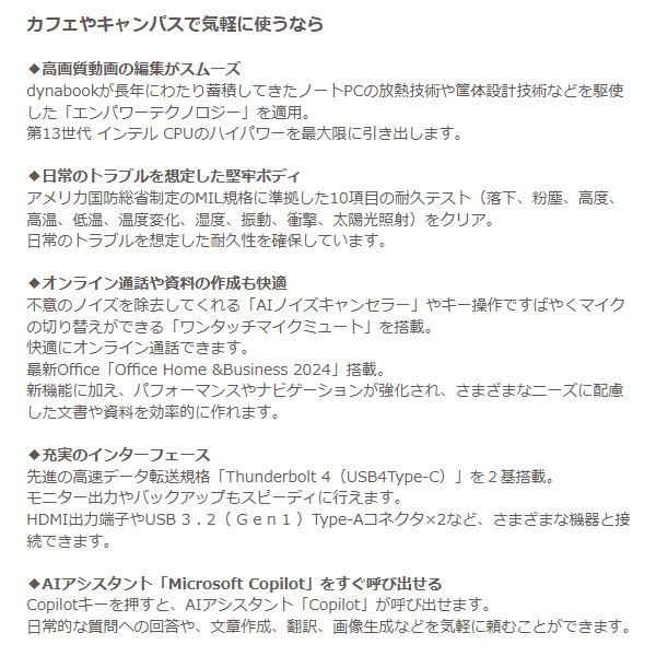 ■OS:Windows 11 Home 64ビット ■ディスプレイ: ・サイズ:13.3型 ワイド(16:9) ・パネル:広視野角 TFTカラー LED液晶(ノングレア)(省電力LEDバックライト) ・解像度:FHD(1920×1080ドット) ■CPU:インテル Core i5-1334U プロセッサー ■メモリ:16GB(16GB×1) LPDDR5-4800対応 SDRAM、デュアルチャネル対応、0スロット(交換不可)/最大 16GB ■ストレージ:256GB SSD (PCIe対応) ■インターフェース: ・Thunderbolt 4(USB4 Type-C)コネクタ(電源コネクタ)×2(PD対応) ・USB 3.2(Gen1)Type-Aコネクタ×2(うち1つはUSBパワーオフアンドチャージ機能付き) ・LAN(RJ45)×1 ・HDMI出力端子×1 ・マイク入力/ヘッドホン出力端子×1 ■本体サイズ:約306.0(幅)×210.0(奥行)×17.9(高さ)mm ■本体質量:約956g ■Officeソフト:Microsoft 365 Basic + Office Home & Business 2024 ※記載は商品仕様の一部です。仕様説明不足等の理由での返品はできません。特に適合等は必ずご確認ください。