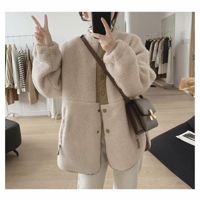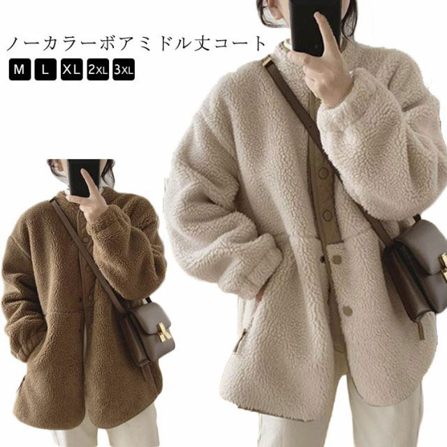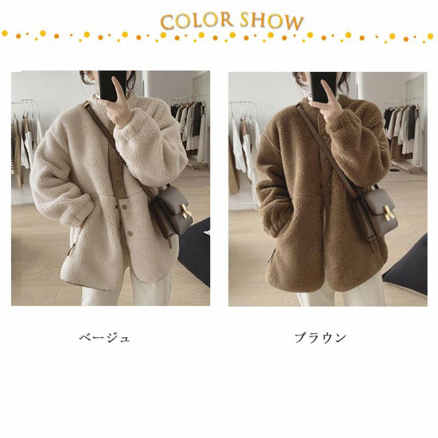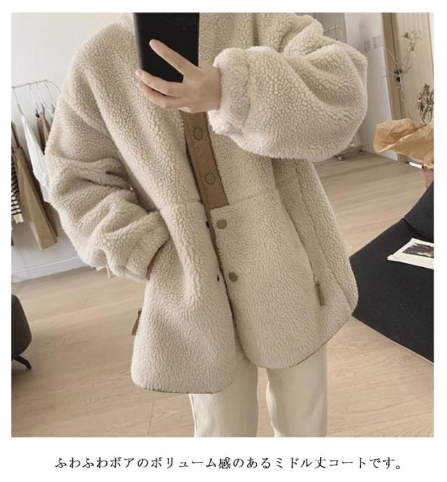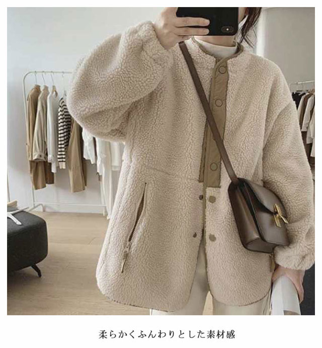 ボアコート ノーカラー ボアジャケット レディース ボアブルゾン ふわふわ もこもこ フリース あったか 長袖 防寒 保温 アウター 羽織り ミディアム丈 きれいめ カジュアル 春 秋