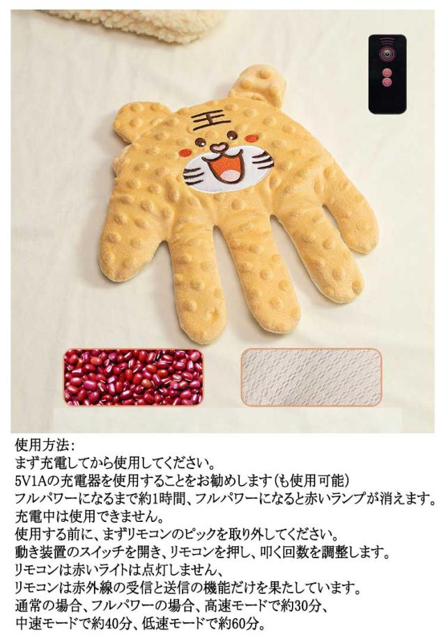 | 【寝かしつけクッション】【指が動く】【加熱できる】 赤ちゃんに安心感を与える電動式ぬいぐるみ。 寝かしつけで大切なのは『安心感』!寝ている時に赤ちゃんに手の触るような安心感を与えます。 指が動き!リモコンでぬいぐるみをコントローラーで、ベビーの寝かしつけになってくれます。 柔らかい素材。抱きしめやすい形と、思わず触りたくなるフワフワな触り心地が赤ちゃんをリラックスさせます。 いつでも清潔に!洗濯機で洗濯可能だからいつでも清潔に保つことができます。 ※中身の物だけ加熱できますので、カバーを外して電子レンジで1分に加熱ください。 使用方法: まず充電してから使用してください。 5V1Aの充電器を使用することをお勧めします(も使用可能) フルパワーになるまで約1時間、フルパワーになると赤いランプが消えます。 充電中は使用できません。 使用する前に、まずリモコンのピックを取り外してください。 動き装置のスイッチを開き、リモコンを押し、叩く回数を調整します。 リモコンは赤いライトは点灯しません、リモコンは赤外線の受信と送信の機能だけを果たしています。 通常の場合、フルパワーの場合、高速モードで約30分、中速モードで約40分、低速モードで約60分。 商品内容:カバー インナー 充電コード 動き装置 リモコン 使用する前に、充電してから使用してください。 充電中は使用できません。 充電コードで充電する。 充電中は赤いライトは点灯しています。 フルパワーになると赤いランプが消えます。 動き装置をインナーに入れて、 (※動き装置は加熱できません) 動き装置のスイッチを開き、 カバーに入れて、 リモコンを押し、叩く回数を調整します。 上は高速モード 下は低速モード | |