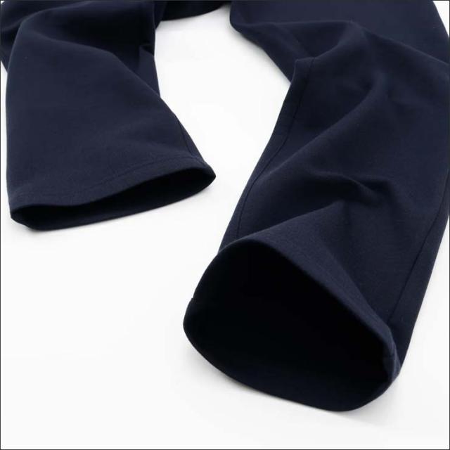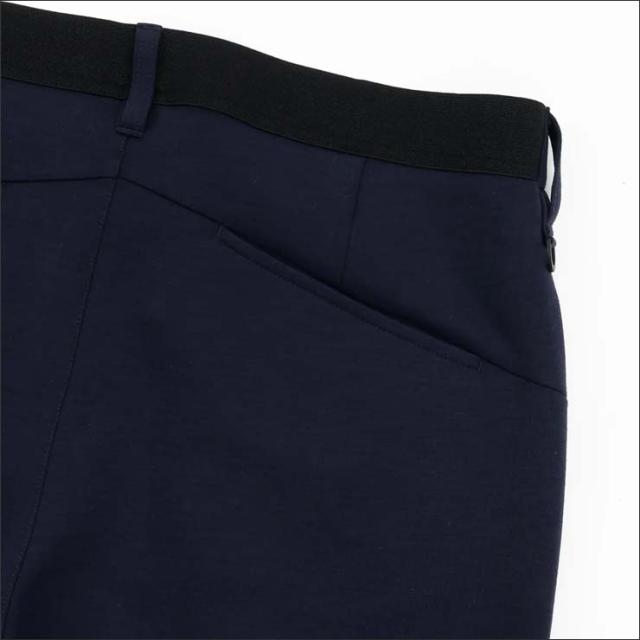 スウェットパンツのように穿きやすいウエスト部にドローコードの付いたボタンの無い仕様でありながら、前開きファスナー、ベルトループを付けています。